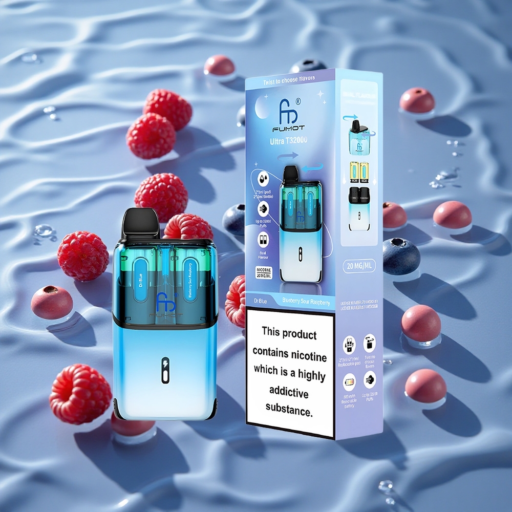 Fumot Ultra T32000 Engangs Vape Dr Blå – Blåbær Sur Bringebær med 32000 Sug og Type-C Hurtiglading